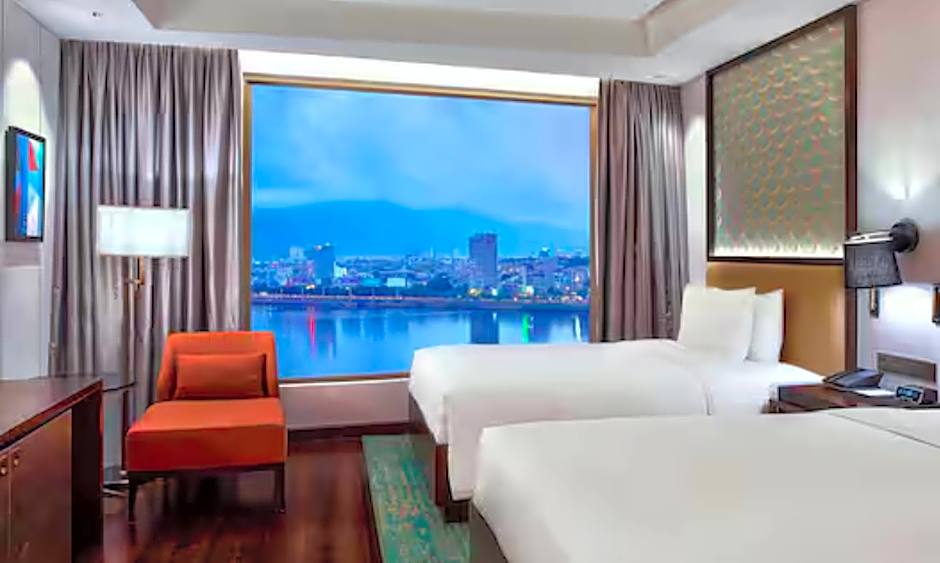 The room includes either the view of Han River or the ocean. The separate living area comes with chaise lounge, sofa, and a well-appointed working desk.